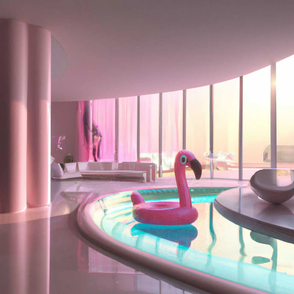 Prompt: a sunlit indoor lounge area with a pool containing a flamingo